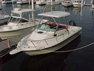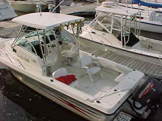 This is a fiberglass walk around fishing/ski boat/overnighter that provides a big boat ride in the roughest conditions. The 225 HP, Johnson out board engine gives good fuel economy and a high end cruising speed. Hard top with rocket launchers, depth and speed. She has a circulating baitwell, full transom fish box, bow pulpit with anchor roller, hydraulic trim tabs, rod holders and swim platform. This is a LIKE NEW VESSEL with approximately 200 hours on the engine.